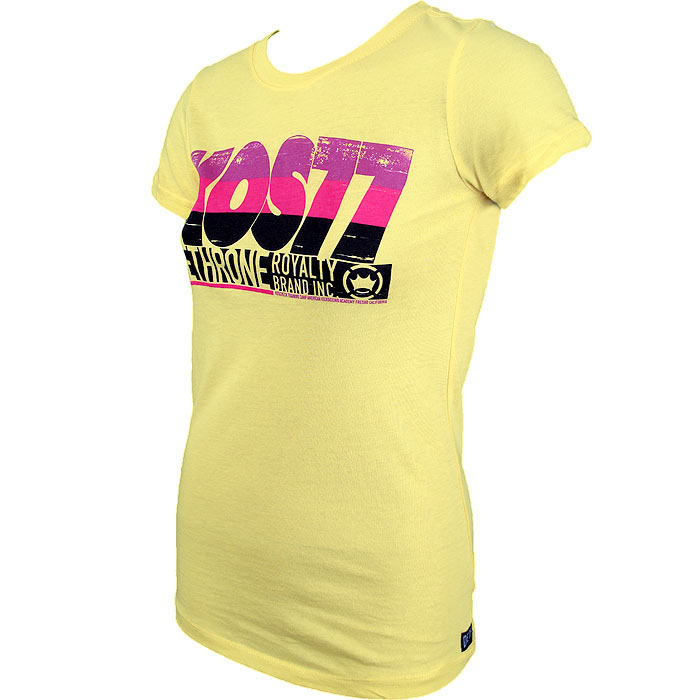 KOS77 text in purple, pink and black stripes and DETHRONE ROYALTY BRAND INC and crown logo on front