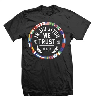 Newaza presents a slight twist to their classic “In Jiu Jitsu We Trust” t-shirt, featuring the iconic IJJWT emblem, encircled by flags from countries in which the gentle art has a large and growing presence. FEATURES:Ultra soft, fine jersey fabricScreen printed designWoven label at hem lineMaterial: 100% cotton