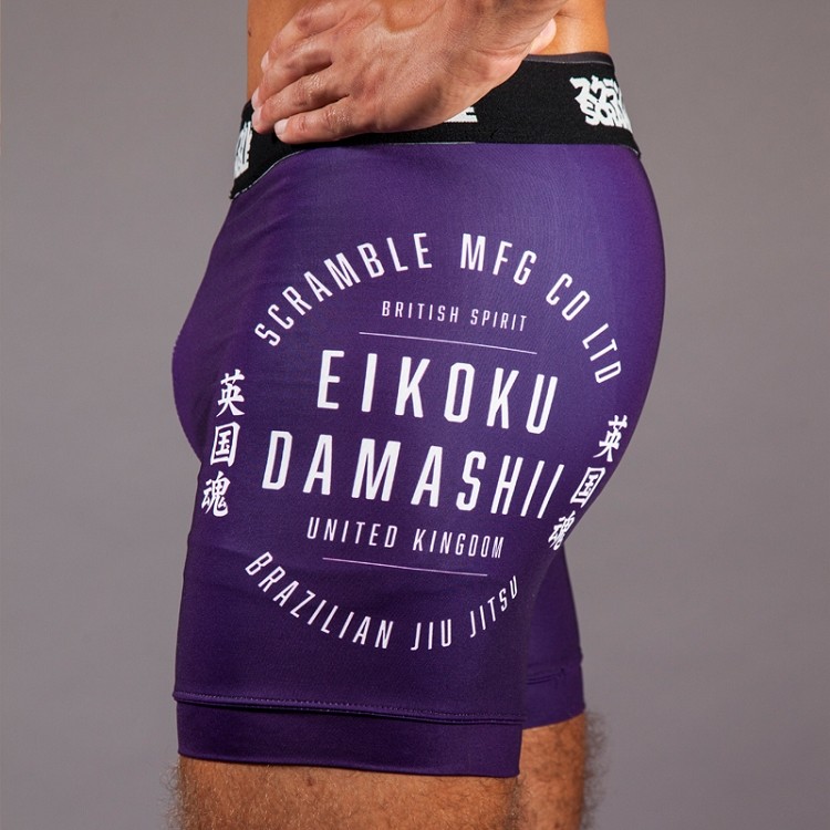 Details SPLOOSH! No these are not the latest in European style mens swimwear, they are however the latest line of Scramble “Real Jiu Jitsu” Vale Tudo Shorts, available in a rather fetching Purple, for the fighting gentleman with nothing to hide and perfect for when the gi just becomes too hot!Great for wearing under your gi or under your board shorts to hold everything in place when training. Please Note: With respect to your opponent, the use of a gentlemen bastion is recommended, but not essential, in conjunction with this product.  Size ChartAvailable sizes:S = 30-32 Inch WaistM = 34 Inch WaistL = 36 Inch WaistXL = 38 Inch Waist