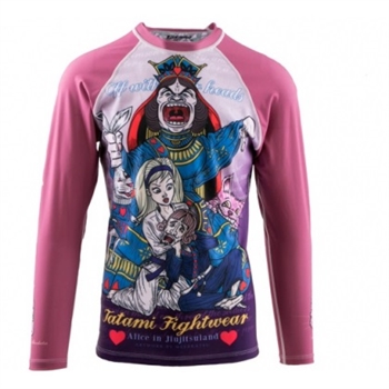 A brand new Tatami x Meerkatsu collab the Alice In Jiu-Jitsu Land Rash Guard. The super high quality rash guard take a a classic childrens novel and gives it a jiu-jitsu spin. Featuring striking artwork and a sharp finish, this rash guard is going to be a big hit.FEATURES:Polyester/Spandex blend – durable, stretchy and moisture wickingFully sublimated graphics – logos and artwork won’t fade, crack, or peelAwesome meditating gorilla original artworkFlat lock stitching – for comfort and durabilityLong sleeves – protects your child’s torso from neck to wrist, preventing scrapes, mat burn and skin born diseasesMaterial: 80% polyester, 20% spandexSizing Guide: S = age 6-8 (120 – 130 cm tall)M = age 8-10 (130 – 140 cm tall)L = age 10-12 (140 – 150 cm tall)Please note: Due to hygiene concerns, because this product is made in part, or in full, of a lycra material, it is not eligible for return or exchange under any circumstances.